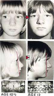 左は10才半の顔で、右が12才の時の顔です。彼女は10才半の時、矯正治療のため抜歯しました。顔を比較すると、12才になった横顛は、下のアゴが明らかに後退しています。顔が平坦になり、貧弱になりました。正面から顔を見ると、下唇が突出し、口元が貧相になり目尻も下がっています。