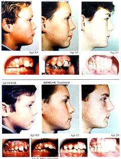 二人の男の子は一卵生親生児です。13才の成長期に上段のBENは抜歯による矯正治療をしました。下段のQUINTONは抜歯をせずに床矯正の治療をしました。歯並びは二人ともきれいになりましたが、BENの横演は平坦です。二人の顔はまったく違った成長をしました。なぜならアゴ骨の発育が異なったからです。それは、顔貌の変化が語っています。